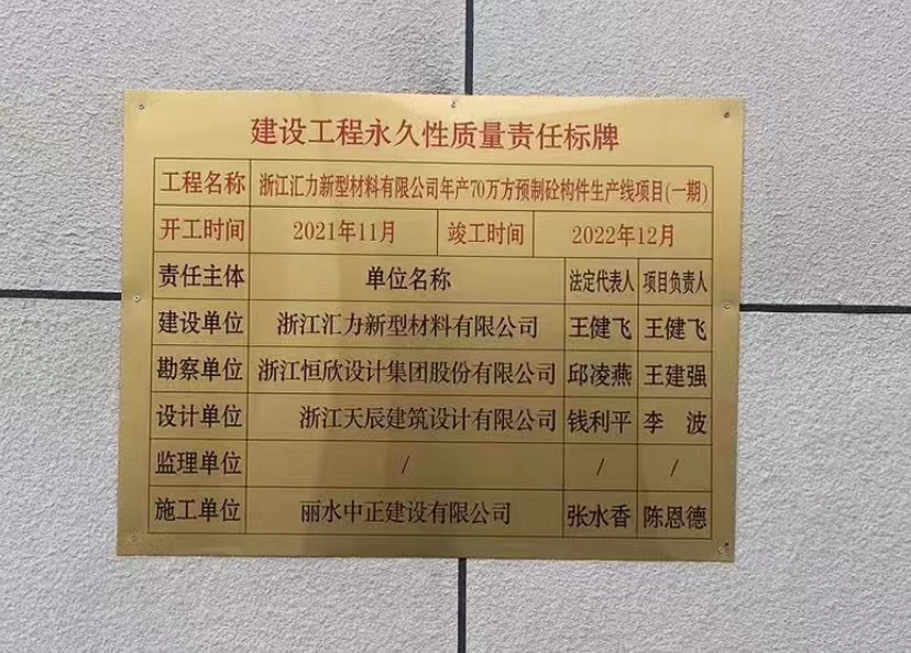 20221214日,相關部門領導、專家組專家通過查看工程現場,聽取工程施工方、設計公司、勘察公司、質量監督等單位的情況匯報,查閱工程資料,專家進行認真討論:一致認為浙江匯力新型材料有限公司年產70萬方預制砼構件生產線項目(一期)工程已按照設計和批復的建設內容全部完成,工程質量合格,可以交付使用。